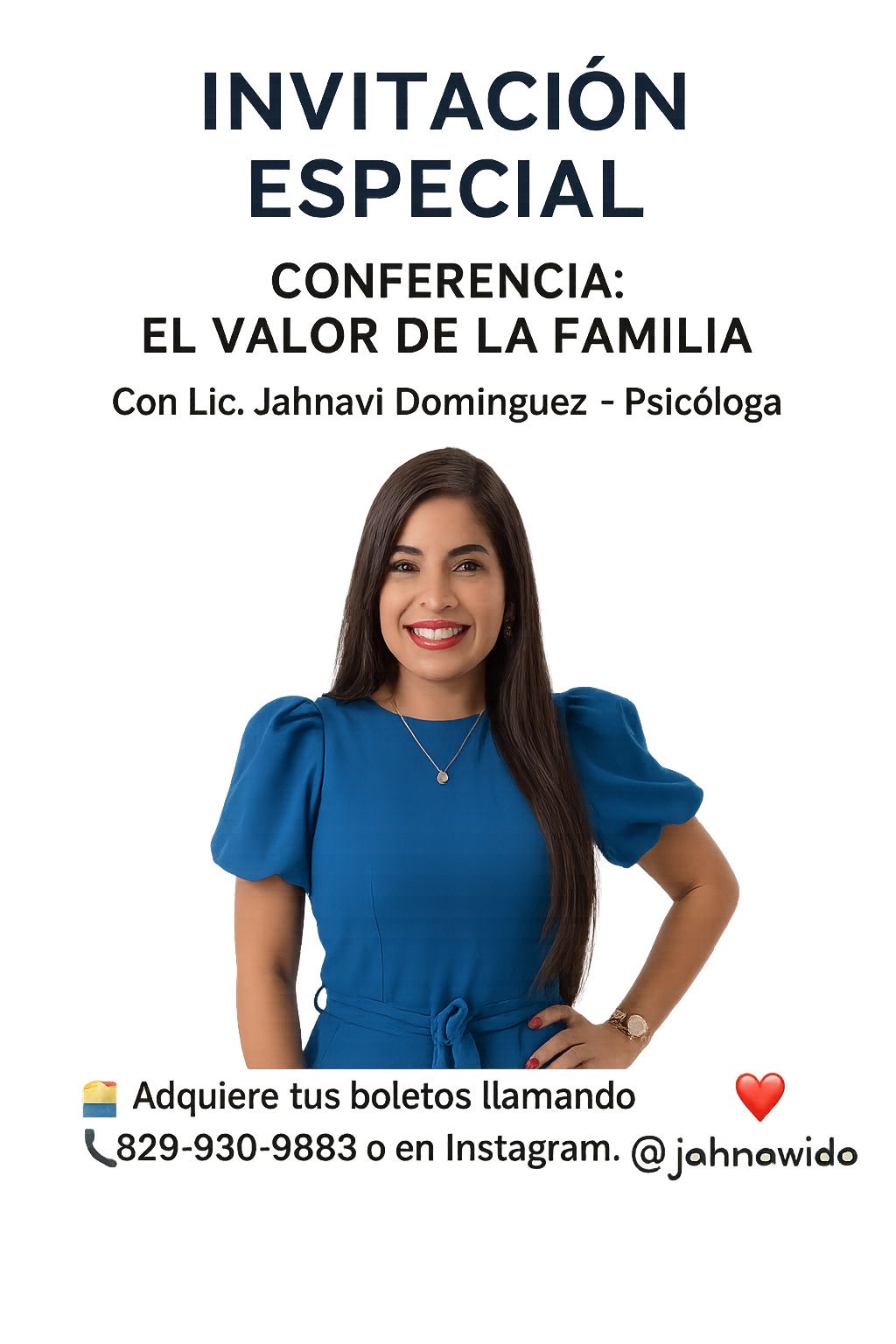 Santo Domingo, R.D. – Octubre 2025* — La reconocida psicóloga clínica y conferencista Lic. *Jahnavi Domínguez* anuncia su próxima conferencia titulada *“El Valor de la Familia”*, un evento exclusivo que invita a reflexionar sobre la importancia de los lazos familiares, el amor incondicional y la salud emocional dentro del hogar.